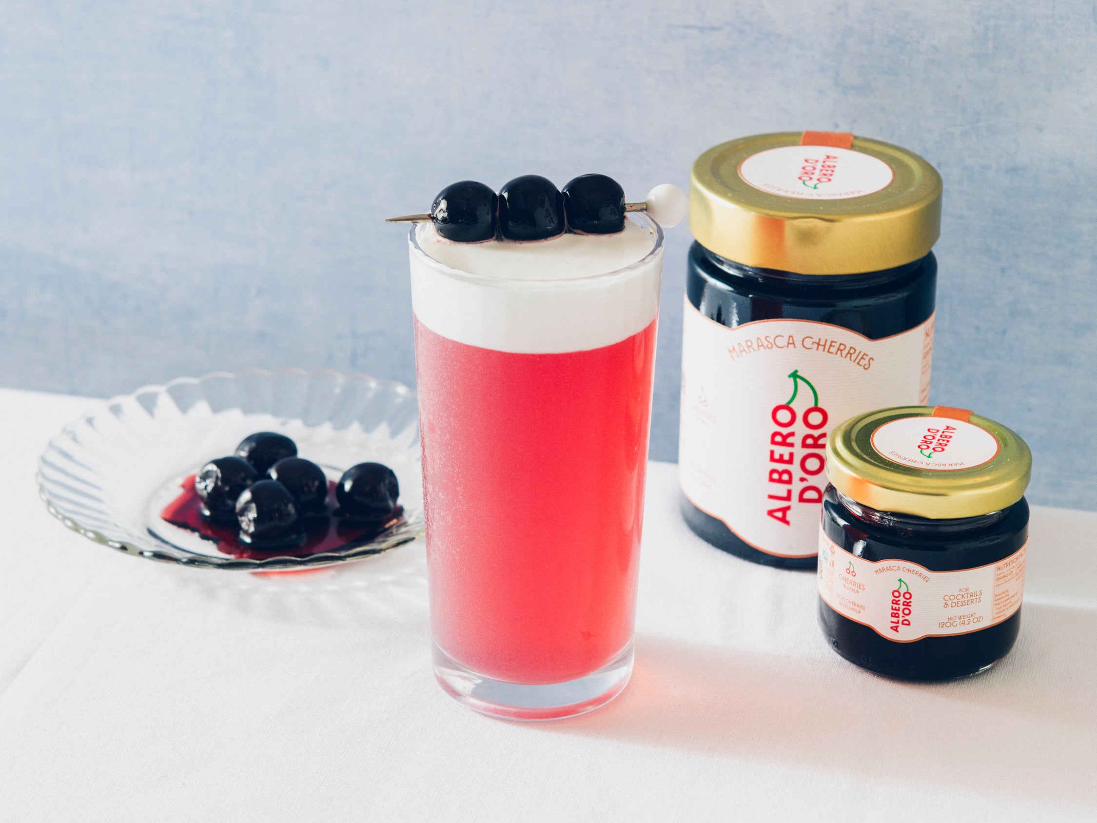Albero d’Oro Cherries are hand-picked, all-natural, Marasca cherries that deliver bright, bold cherry flavor and a touch of luxury to every glass or plate. Each jar is packed in a luscious, velvety marasca cherry syrup—deep red, naturally rich, and bursting with dark fruit flavor. Ideal for cocktails, desserts, or a decadent drizzle. 50% Cherries 50% Syrup.
